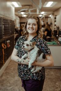 Chloe is a local girl, related to what seems like half our clientele! In her free time Chloe loves to spend time with her dog, Moose, a cockapoo! She is an avid tea lover, enjoys kayaking & hiking during the summer, as well as conquering videogame worlds.Chloe loves to cuddle any cockapoo dogs that come in to the clinic, and she has a special place in her heart for special needs kittens too.